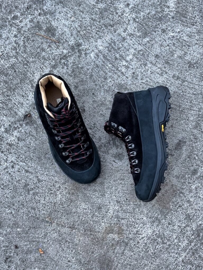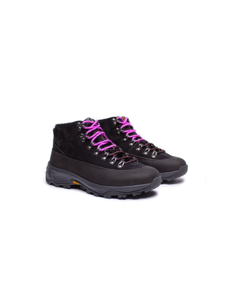 Suede calfskin outdoor boots, natural calf lining. Vibram Arctic Grip compound outsole. Comes with two pairs of laces (choice of black and red or mauve). Designed and manufactured in Italy.