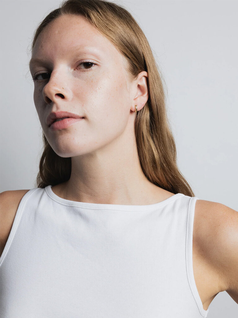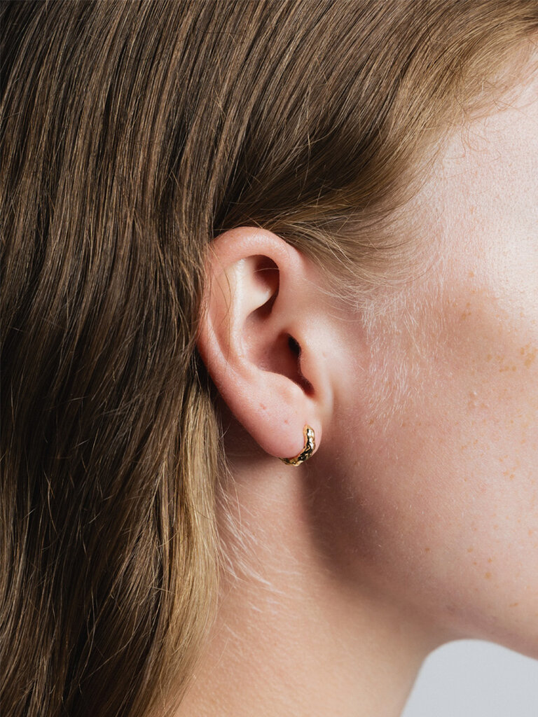 Textured huggie hoop earrings in recycled brass plated with 14k gold, featuring hypoallergenic 14k gold-plated hinges. Inner diameter measures 7mm.