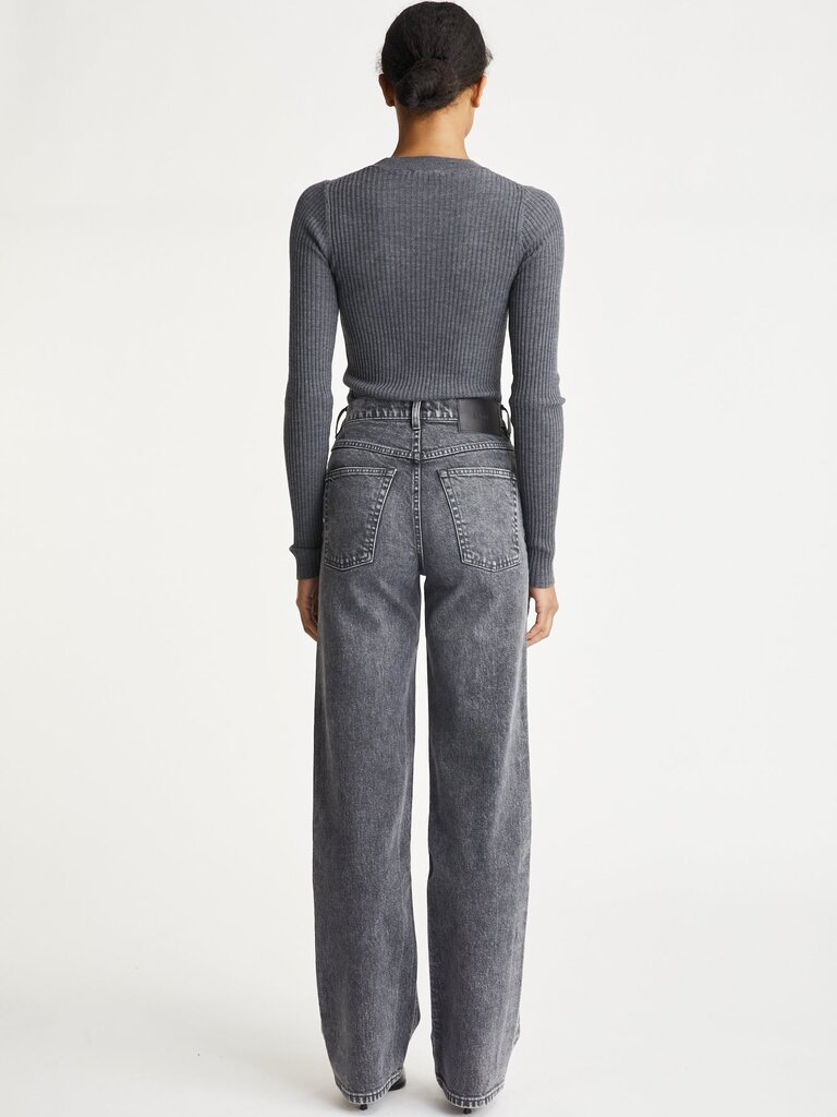 Livid's classic high-waisted straight jeans in a mid-grey wash. 12 Oz comfort wideloom denim woven by Candiani in Italy. 98% cotton 2% elastan. Black vegetable tanned leather patch made in Italy. YKK zip fly and rivets. Designed in Oslo. Made in Portugal.