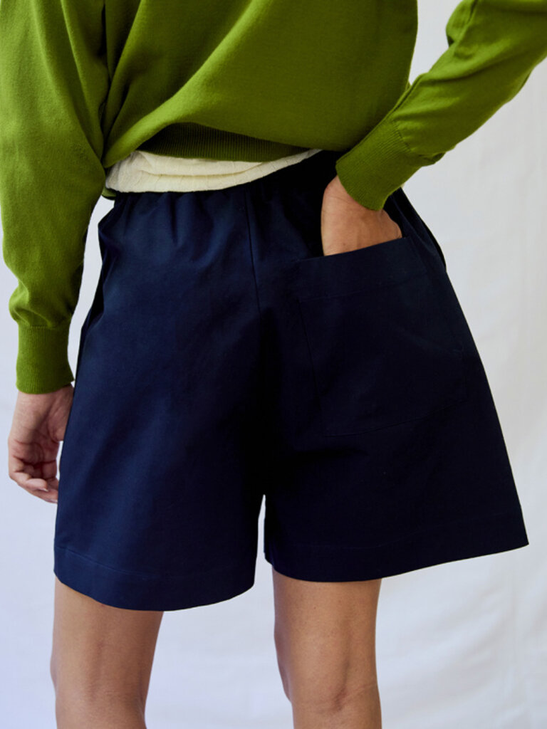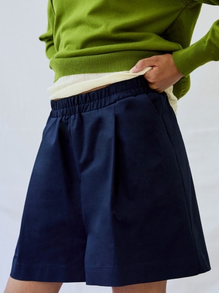 Pull-on bermuda shorts in cotton-linen twill from Spain. Features deep front pleats, an elastic waistband, slash side pockets, and a patch pocket in the back. Timeless, zero-waste style and locally made.