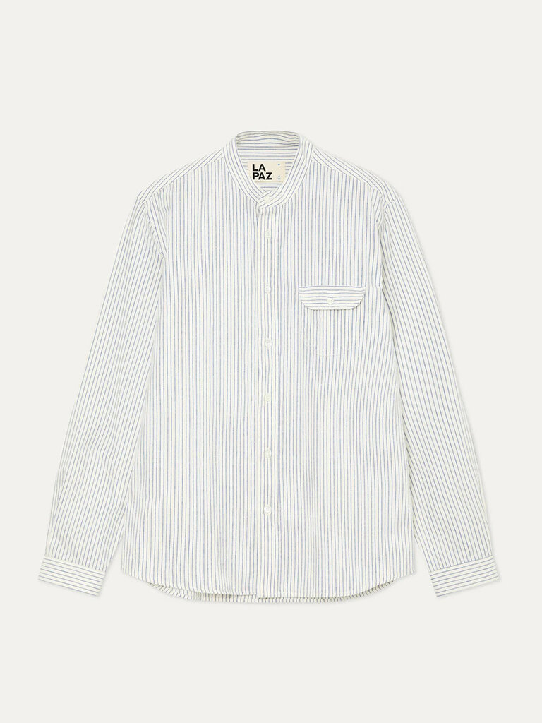 Crafted from a breathable cotton–linen blend, this banded-collar shirt features blue pinstripes and a practical buttoned chest pocket.